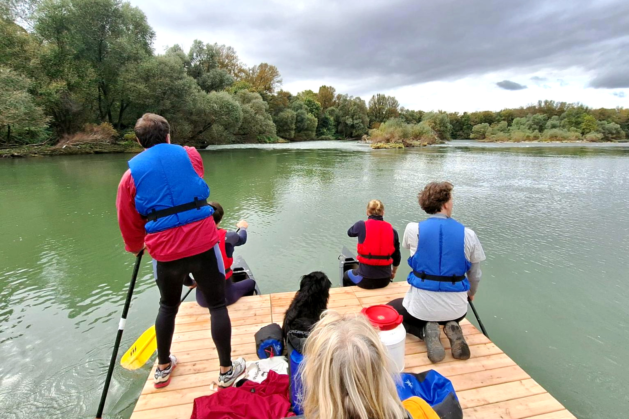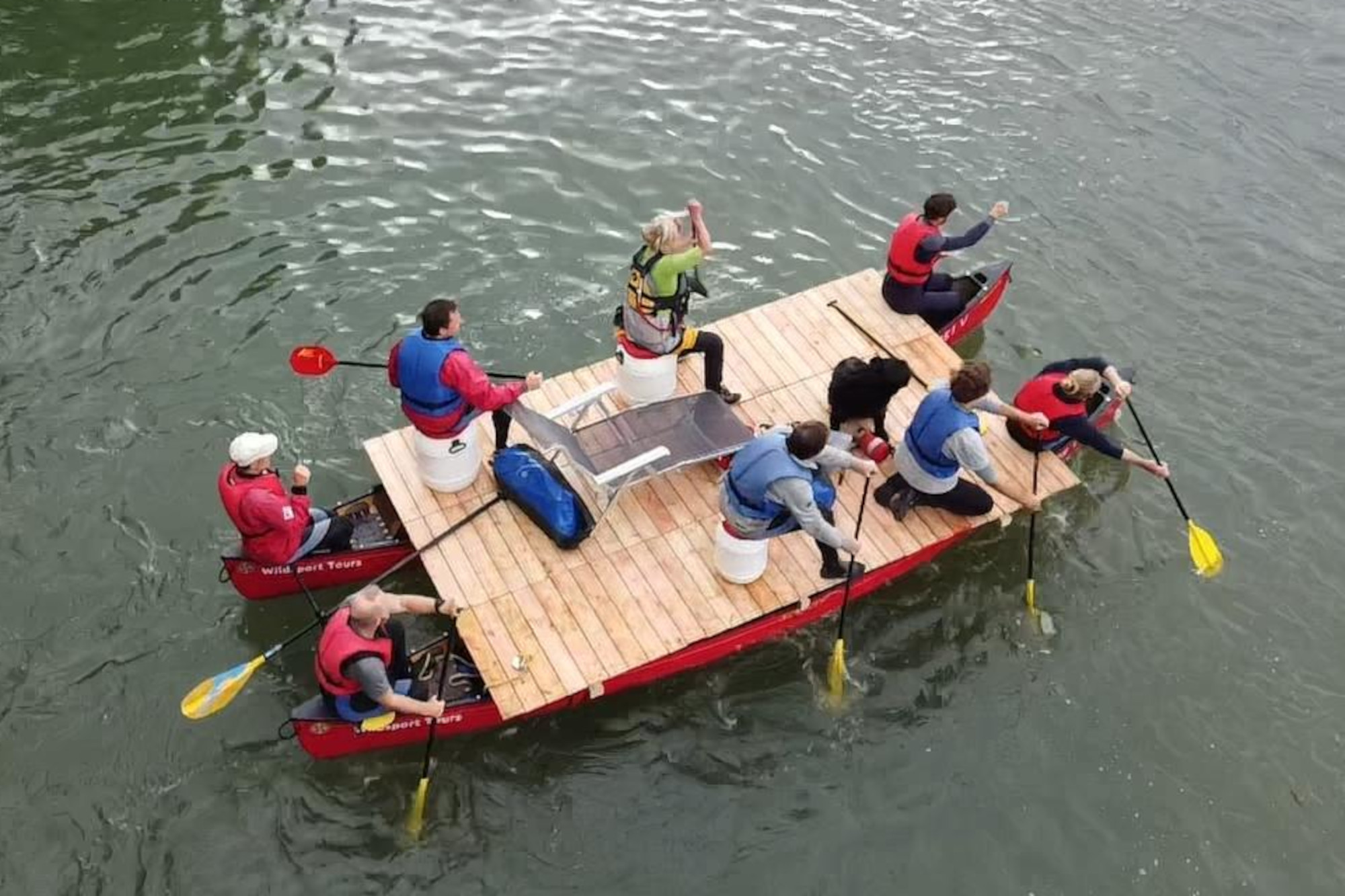 Unser Floß ist ein Kanu-Katamaran. Er besteht aus den größten Kanus unserer Flotte, die viel Volumen mitbringen. Eine massive Plattform bildet das Oberdeck, auf dem für bis zu 10 Personen Platz ist. Gesteuert wird der stabile Katamaran durch alle Teilnehmenden an Bord unter Anleitung des Guides. Die Bauphase ist nur sehr kurz, denn wir möchten mit Euch die Zeit auf dem Wasser genießen. Ist Eure Gruppe größer als 10 Personen, starten wir mit 2 Flößen. Alternativ stellen wir auf Wunsch ein paar unserer Kanus, um für Abwechslung zu sorgen und um mehr Interaktion bei den Teamspielen zu ermöglichen.
